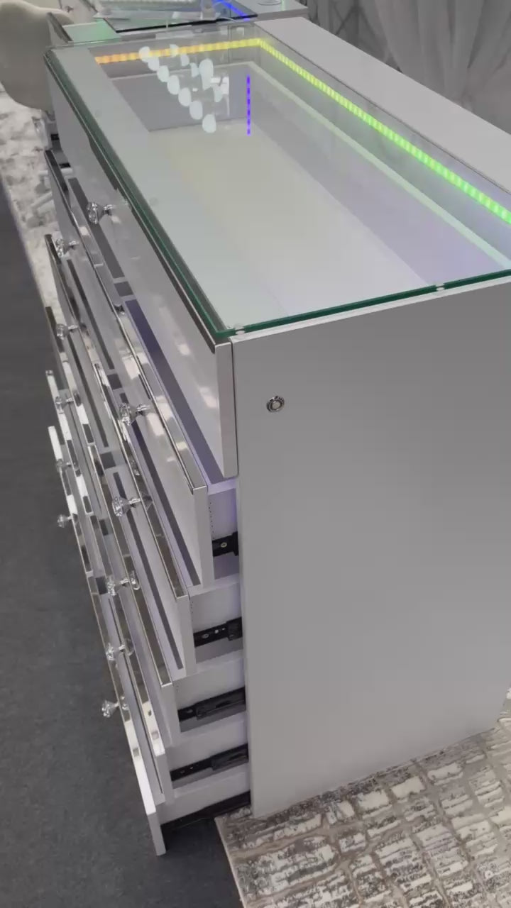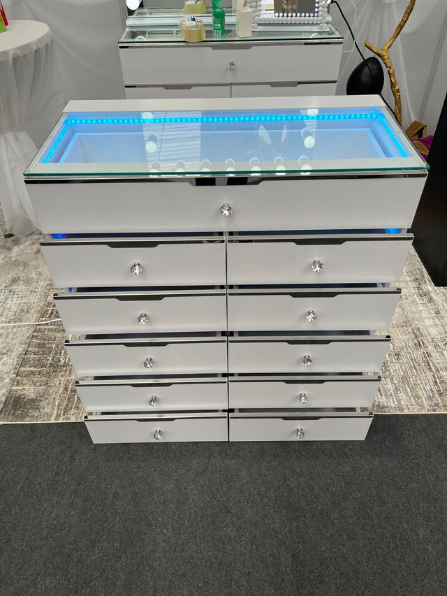 Elevate your room with this elegant vanity boasting 11 large drawers, each fitted with zinc alloy crystal handles for a chic, dazzling look. The integrated light strip on the desktop and drawers offers seven stunning colour choices, including rainbow waterfall, to create the ideal ambiance.
