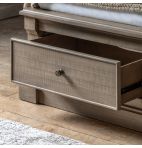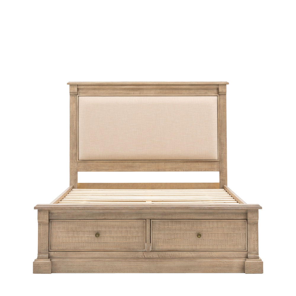 This bed is a stylish and functional addition to any bedroom. Its weathered wood frame exudes a timeless charm, while the upholstered headboard provides a touch of luxury and comfort. The built-in storage drawers offer ample space for bedding, clothes, or other items, making it a practical choice for smaller spaces. This bed is perfect for those who appreciate a blend of rustic style and modern convenience.