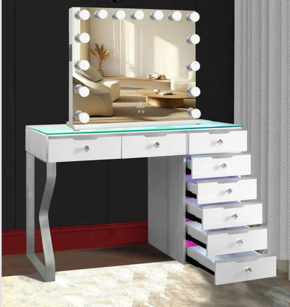 Transform your space with this stunning vanity workstation, designed for those who demand both elegance and innovation. Featuring 8 spacious storage drawers, each adorned with sparkling zinc alloy crystal handles, this piece combines beauty with practicality.