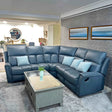 Elevate your home décor and furniture to new heights with the Bergamo Leather Recliner Corner Sofa in navy. Upholstered in premium dark grey leather, this corner sofa exudes elegance and sophistication, making it the perfect addition to your living space.