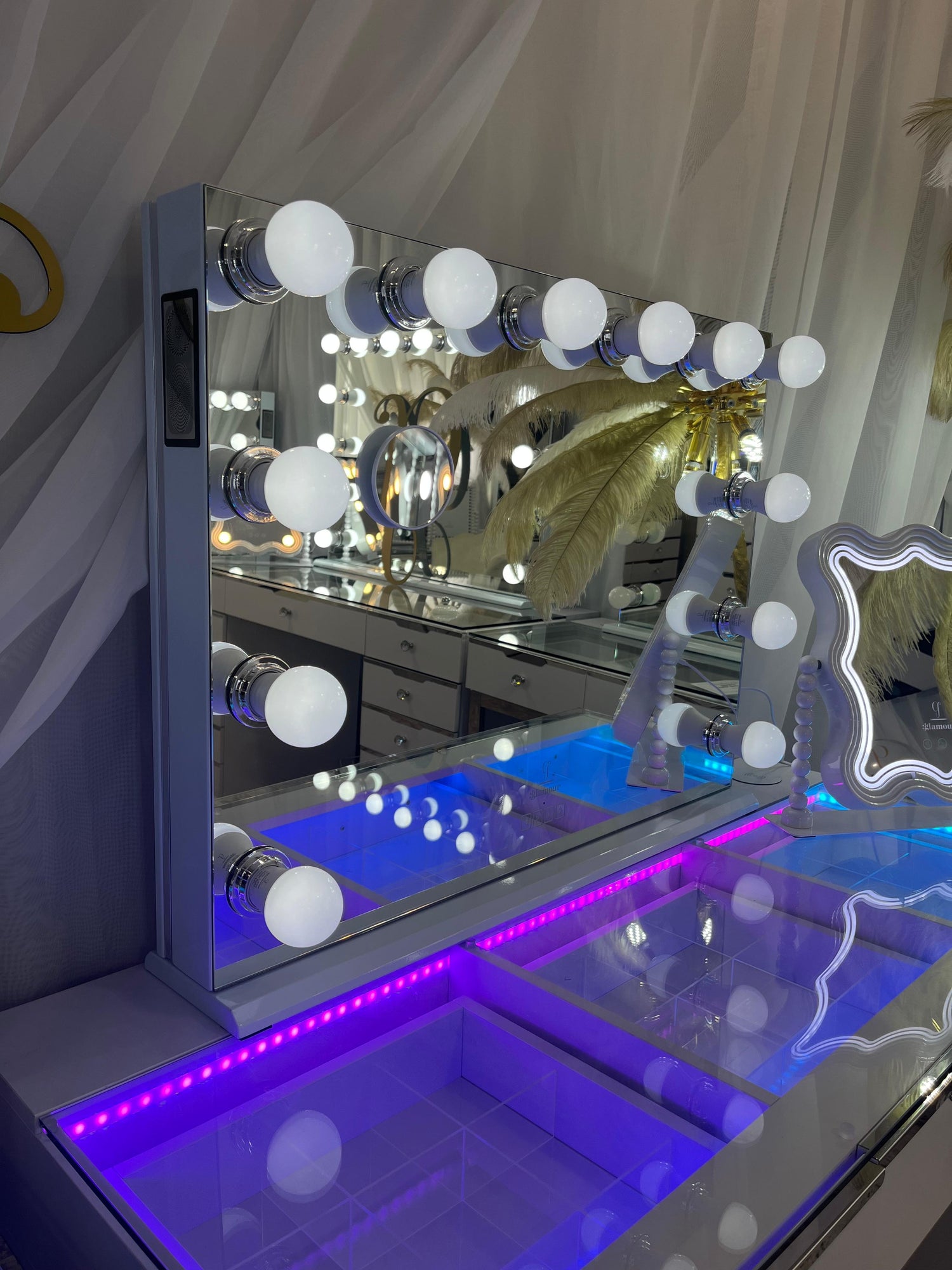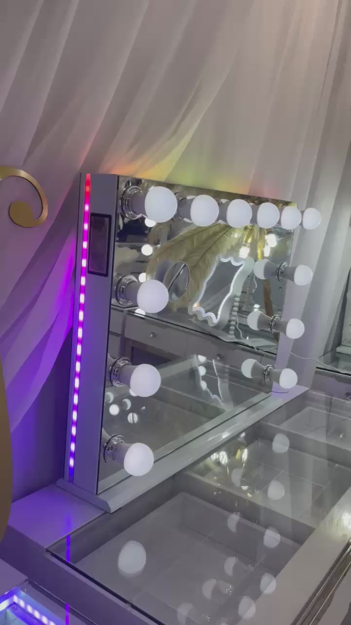 Elevate your beauty or workspace with the Glam Landscape Mirror, featuring 12 dimmable LED bulbs for bright, adjustable lighting. The intelligent touch control lets you effortlessly switch modes and brightness, while built-in Bluetooth speakers keep you entertained with music or calls. Stay powered with integrated UK sockets, USB, and Type-C ports, making this mirror as functional as it is stylish.