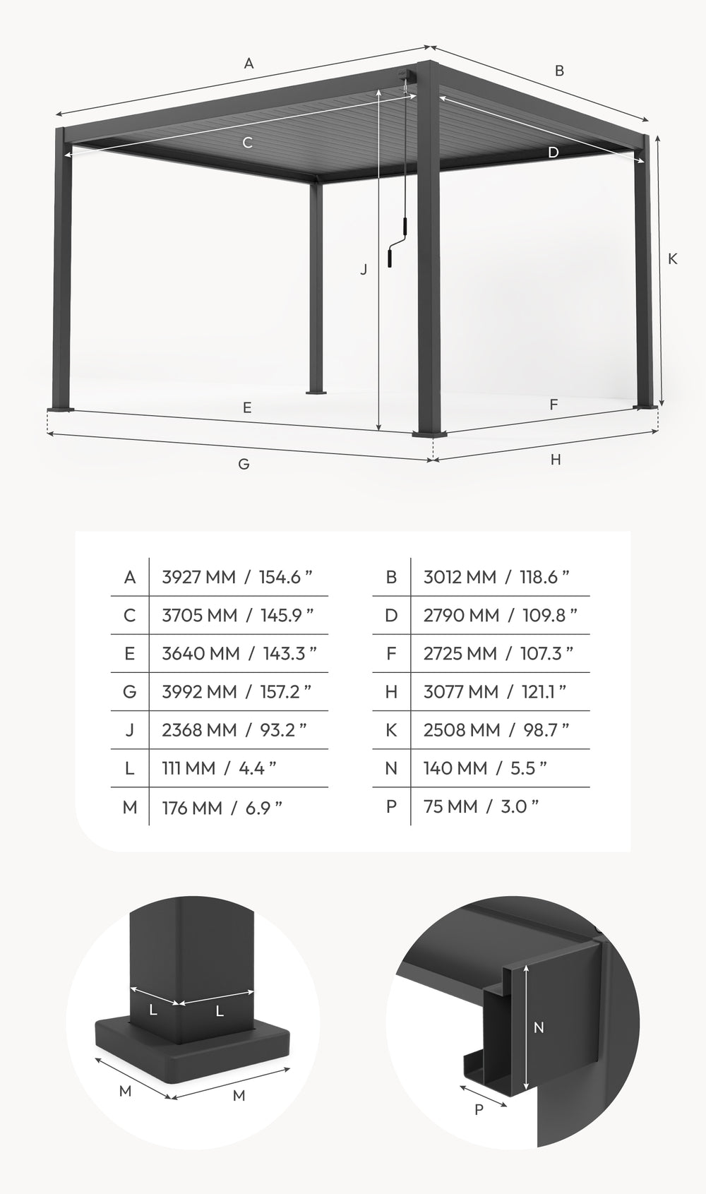 Built with a robust, weather-resistant aluminium frame, the Hilton pergola is finished with a premium TIGER Drylac powder coating for long-lasting protection. UV resistance helps prevent fading, ensuring your pergola maintains its appearance season after season.